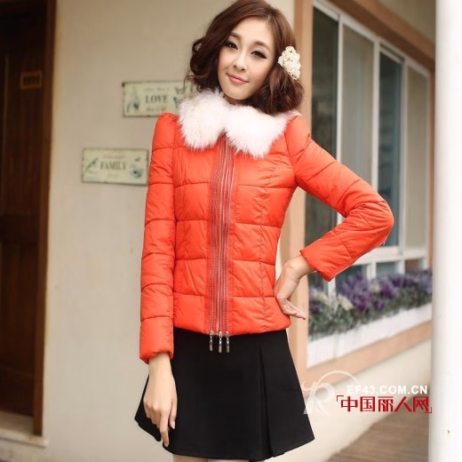 靓丽的橘红色短款棉服简约的款型,韩版的设计,有淑女范儿。白色的毛领点缀,为整体增色不少。是不是很有大家闺秀的婉约呢?如果喜欢,你也可以这样穿的。下面黑色的小短裙,俏皮甜美。