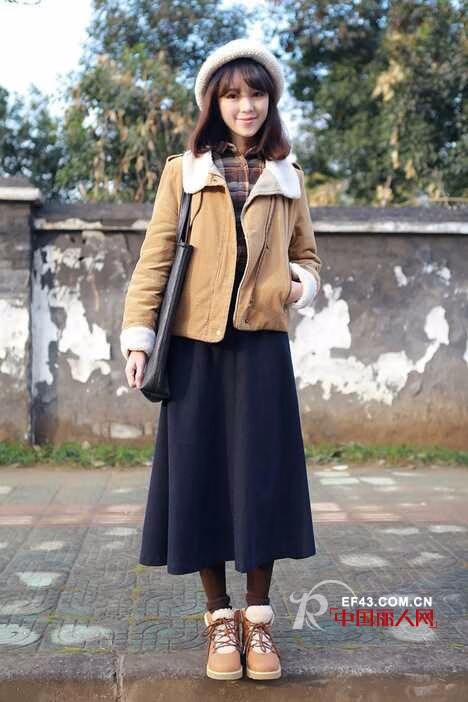 小巧玲珑的短款呢子衣也有它的特色。简约的款式,亲肤的质地,白色的毛领和手袖拼接,很是俏皮可爱。里面搭配格子衫,下面的宝蓝色半身裙也很好看。整套在一起毫无违和感。