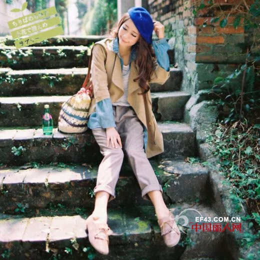 这件中的衣服和上面的一款相比,突出一点俏皮和女人味。里面搭配蓝色的长袖衬衫,色彩冲击给人带来视觉上明亮的快感,会赚来不少回头率哦。灰色的休闲裤和陀色休闲鞋都简约大方,很适合爱美的姑娘。