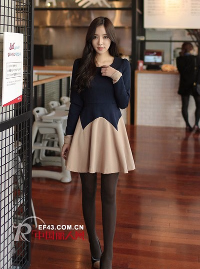今年冬季还是很流行的撞色连衣裙,藏蓝色和裸色的搭配看起来很养眼了,修身的设计很剪裁,让MM们在室内都有好身材了,搭配上高跟鞋,再外搭上大衣或是羽绒服都很温暖好看了!