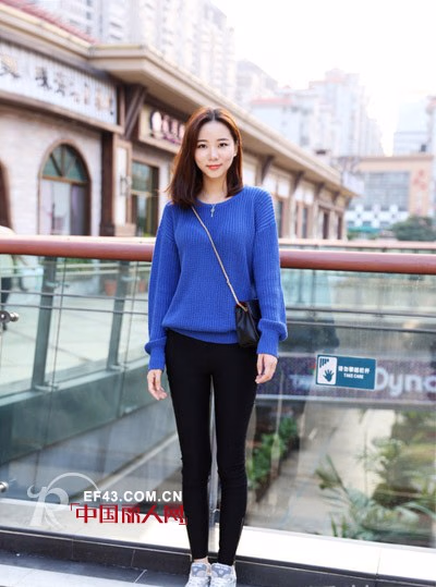 宝蓝色简单针织衫,搭配一条黑色紧身裤,一双轻巧运动鞋,配上一个金属链条包包,这身简单的搭配凸显沉静高贵的气质,让你在黯淡的秋天拥有与众不同的色彩,是金秋不容错过的一身装备。