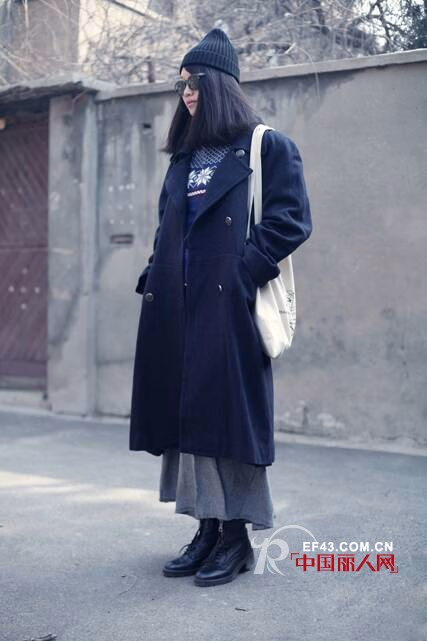 藏青色的毛衣由小百花点缀,甚是清新。外面搭配藏蓝的超长款双排扣风衣,很有英伦街头风格。配上里面灰色的超长裙很有女人味,瞬间提升了品位。