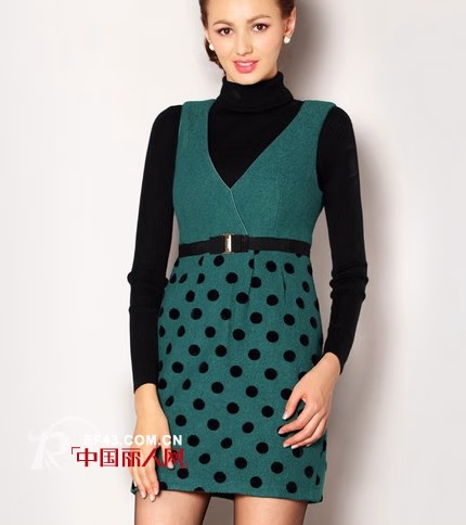 同样是背心裙,也同样是V领。稍深的V型领更容易和打底融为一体,上身的纯色与下半部分的波点形成小小的对比,重复和排列的魅力通过一颗颗波点就能分明。一条细细的腰带将上下连接在一起,提高的腰线显瘦很容易。