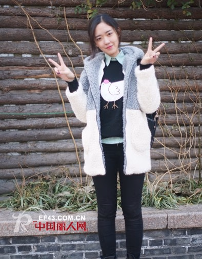 白色毛绒拼接棉衣外套,温暖可爱的设计,穿在身上暖和时髦,简约大方的风格,十分好看。连帽款式更能凸显可爱的味道。内搭卡通图案打底衫,下穿黑色紧身裤和帅气短靴,迷人养眼。