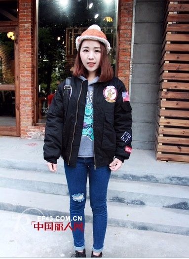 黑色短款棉衣外套,黑色穿在身上最显瘦,也十分百搭,短款适合身材娇小的女生穿,可以拉长身材比例。内搭卫衣下穿紧身牛仔裤和帅气短靴,戴着毛线帽,吸晴时髦。