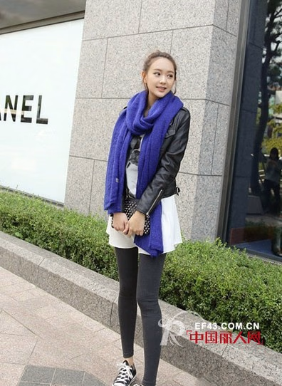 蓝色长围巾+黑色机车夹克+白色连衣裙+棕色打底裤+黑色帆布鞋。