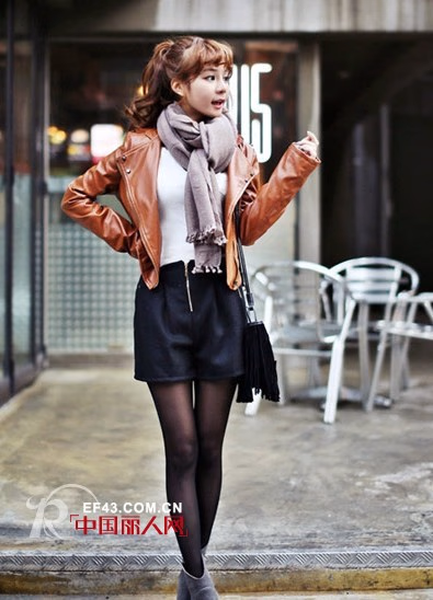 灰色围巾+白色毛衣+棕色机车夹克+黑色短裤+黑色丝袜+灰色麂皮踝靴。