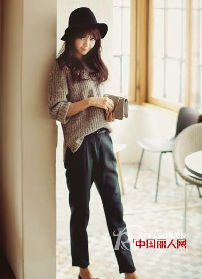 时尚套头毛衣推荐1灰色套头毛衣简约大方,搭配黑色西装裤,尽显文艺风。黑色毛毡帽复古感十足。铆钉皮鞋点亮整体造型。
