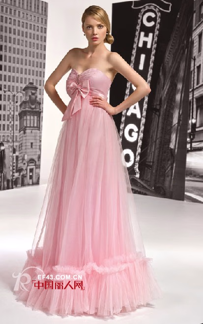 这件粉色的抹胸礼服,甜美可人。蝴蝶结的装饰,摆脱了裙装的单调感。从胸部往下的粉纱系列,有种舞动的柔美。礼服摆小花的点缀甚是精美。这件礼服适合肤色白皙的,长相甜美的女人。