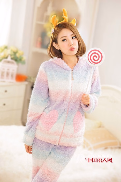 渐变色的家居服款式,口袋还是可爱桃心设计的,很有小女生的感觉,如果你是一个女强人,那么回到家你是不是该放下你伪装的面孔,做回小女人呢?这样才可以找回你自己,这样才不会太累哦。