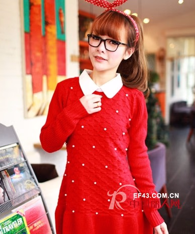 很美很亮眼的一款红色针织裙 ,白色的小圆领以及衣身上的珍珠装饰,衬得女孩格外的娇美可人。下摆荷叶边的设计,也很时尚哦。这件红色的连身裙,下配黑色打底裤就很美呢。
