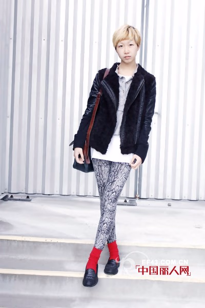 这身搭配会是很多中性风格女生的大爱。精简的黑色外套搭配灰白色的打底衫,干练帅气。有特色的集中在臀部以下。打底裤颜色像是地球表面的水和陆地,墨蓝和白色相搭的天衣无缝。下面黑红色的高邦休闲鞋为整体增亮不少。这样的装扮配上黄色的短发非常适合。