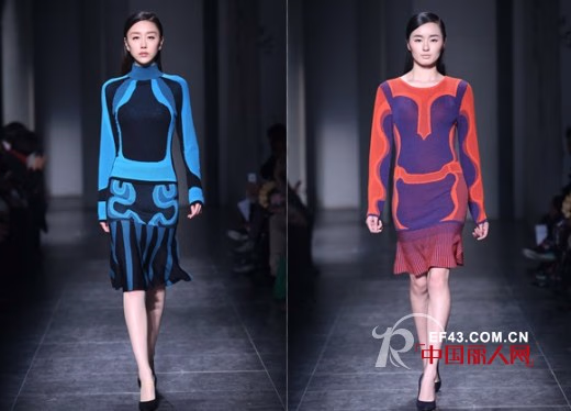 胡露露将抽象的光谱图案融入到针织直身裙中,在裙摆处采用渐变的条纹以及不同的针织纹理与裙身形成鲜明的对比,高饱和度的配色也更为适合春夏。