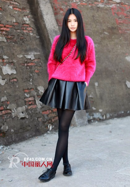 马海毛毛衣搭配黑色皮质短裙,玫红色的毛衣款式亮眼无比,中分女王范的发型长发飘飘,即有学院风的叛逆,又有时尚街头达人的潮流,毛衣短裙搭配就是应该配上平底鞋才更好看。