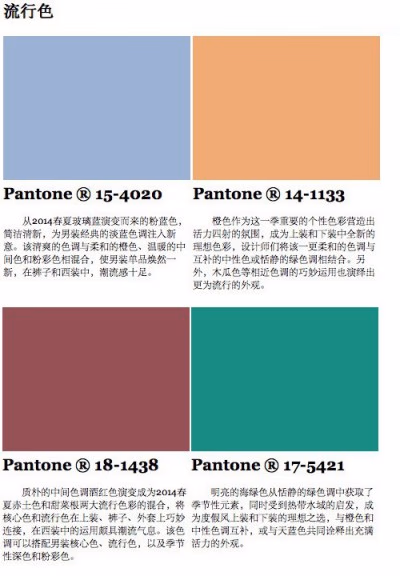 2015春夏男装色彩流行方向趋势小编为您带来针对2015春夏男装市场的全球色彩流行方向分析报告,涵盖了男装色彩矩形图和季节性关键色彩分析–对核心色、流行色、提亮色以及色彩的运用进行了探索。该报告是基于聚焦、历史2.0和生物动力三大宏观趋势展开的,对休闲装和正装品类进行了分析。女性|mgsrchttpsom色彩男装春夏关键流行色历史