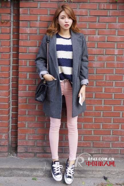 灰色的呢子大衣不再只是男生的专属了,女生穿起来也是别有一番感觉。里面搭配条纹针织衫,下面粉色的铅笔裤,大方时尚,甜美俏皮。脚上简约的黑色帆布鞋,很有动感。处处洋溢着青春与活力。