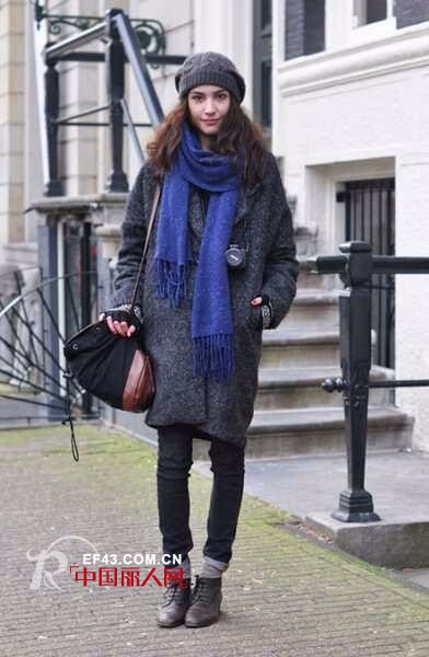 怎么搭出欧美风?小编支招,一件长款呢子大衣,休闲帽,小脚裤就能搞定。如图中,卷发女人身穿深灰的呢子大衣,头戴冬帽,手提帆布包。最抢眼的要属宝蓝色的围巾了,十分衬肤。休闲牛仔裤简约帅气,如果再配上双铆钉鞋就非常完美了。