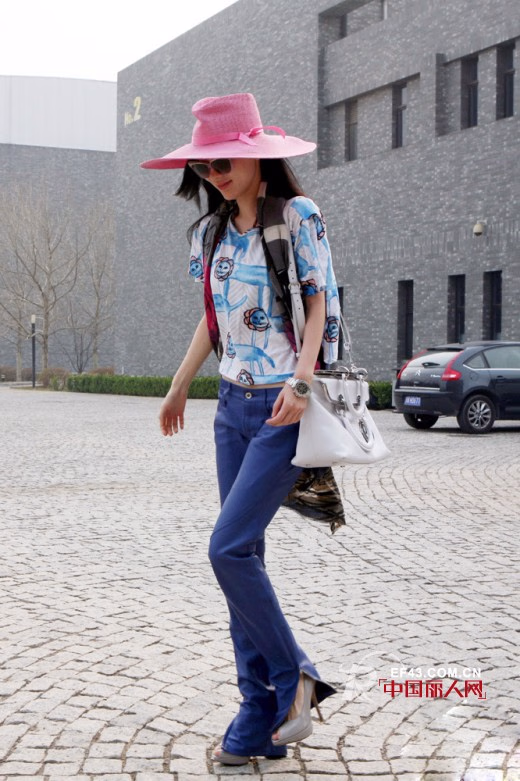 霍思燕非常懂得如何凸显出最佳的身材比例。首先选择一条合身的微喇宽腿牛仔长裤,穿上高跟鞋,让裤子长度盖过高跟鞋,使双腿看起来变长。随后再搭配印花短袖衫,头上的粉色大檐帽又成为了新亮点,立即提升了整体的时尚感。