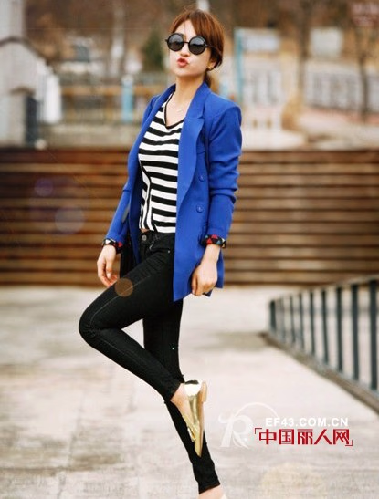 宝石蓝西装外套+条纹T恤+紧身裤,气质高雅,简约又显瘦。