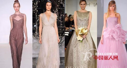 活泼生动的彩色婚纱非常适合在秋冬季节穿着,香槟、银灰、大地色系是不出错的安全牌,而2014秋冬Vera Wang更是推出全系粉色婚纱,明亮的珊瑚色让人眼前一亮。