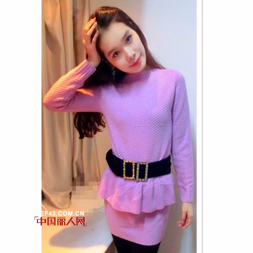 这件浅紫色针织衫运用花样织法,下面收臀裙,荷叶摆,很是甜美。紫色针织搭上黑色腰带,也是勾勒迷人线条。下面直接穿上白色糖果点的丝袜,塑造一萝莉美女。