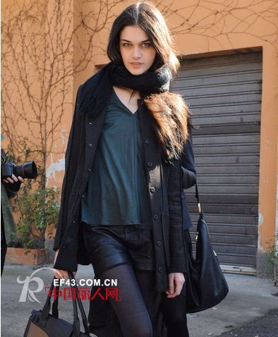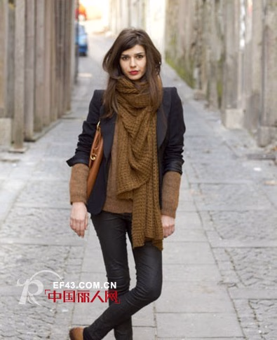 针织围巾+皮裤,黑色针织围巾+小西装外套+皮裤,洒脱率性!