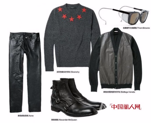 针织和皮革形成强烈的质地反差,令这件针织开衫个性张扬,搭配黑色皮裤与短靴,彰显酷味十足的时髦气质。