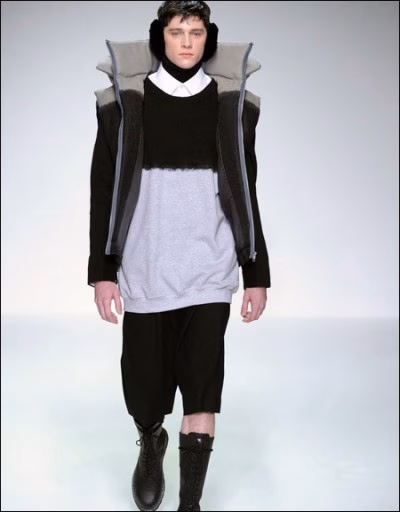 运动潮流依然是本届伦敦男装周的一大趋势,尤其是面向青年市场的男装。运动的元素包括今年夏季备受追捧的棒球和篮球元素得到了进一步演绎;与秋冬季相关的是新加入的冰上曲棍球运动等冬季运动元素。这一点看看Shaun Samson的服装秀就了解了。而大多数走运动风的设计师还是选择了运动套装作为主打单品,亮点是夸张或新颖的版型,极具触感的面料拼块以及一些雕塑形态的面料比如印花氯丁橡胶和粘合平纹织物等。