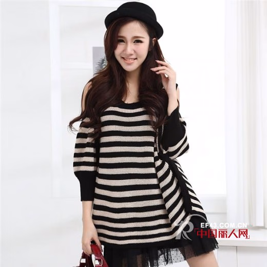 这件经典黑白条纹的针织衫很大方有型。不管稍胖还是偏瘦的女孩都可以选择哦。它的亮点集中在肩部,露肩的设计为复古元素增添了时尚新流。避免了一味的单调复古。露肩却又能使小香肩若隐若现,俏皮性感。