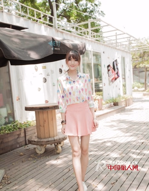 印花的雪纺衬衣是今年秋很流行的服饰款式呢,淡淡的白色上衣搭配上俏丽的印花,气质逼人呢,粉色的高腰短裙搭配上白色单鞋,很显高挑呢!