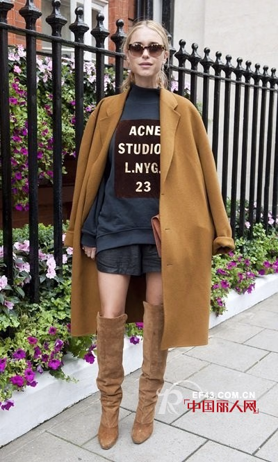 黑色很低调,驼色却极为抢眼。大衣负责保暖身体与升华气场,字母图案的运动T恤衫+短裤,一切就刚刚好。这样的气质组合拥着女性的妩媚,骨子里却散发出潇洒帅气。