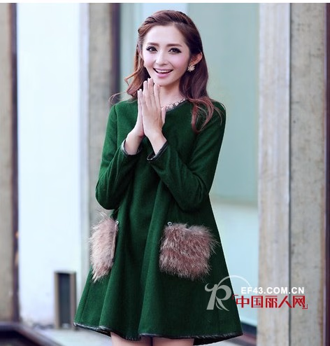 都市清新范儿,分开来看,一半是都市时尚感清丽脱俗,另半是文艺清新感不拘一格,毛呢大A摆+PU包边,演绎小香风的浪漫却超越小香风的经典,两个皮草外贴袋最是品位卓然的俏皮升级。