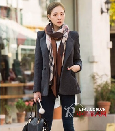 灰色小西装外套搭配紧身裤搭配及踝靴,很简洁帅气的搭配。几何图案组合的大围巾,沉稳大气而又不张扬,特别适合OL,时髦又知性。