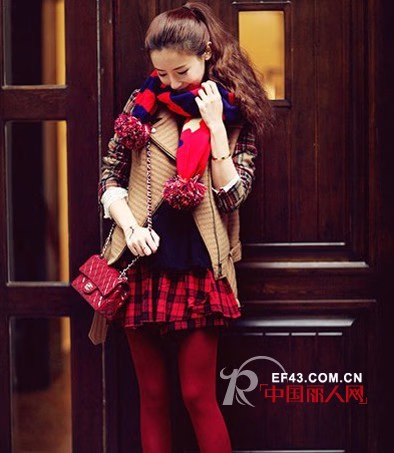 这条围巾的色彩和身上的上衣和小裙子都非常和谐。围巾上的毛毛球更是突出了小女生的可爱俏皮特质。外套+马甲搭配红色格子小短裙甜美又时尚,轻松打造小V脸。