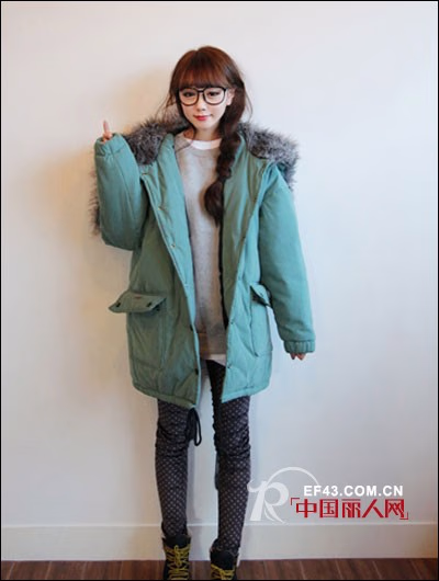 休闲款式的棉服,冬季也很好穿搭,宽松的版型显瘦不会显臃肿呢,而且格外的保暖哦,淡淡的湖蓝色很是小清新呢,毛绒绒的帽子很俏丽呢,灰色的针织衫打底,内搭衬衫,很有个性的混搭,波点的打底裤搭配上高帮的运动鞋,舒适大方很是甜美。