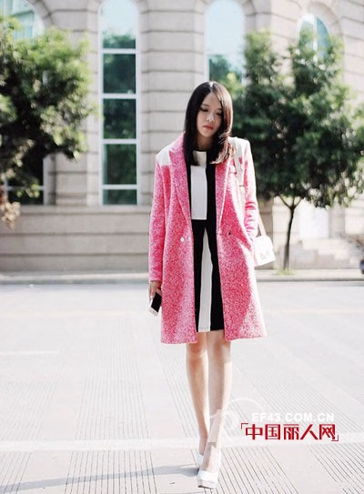 粉红色的呢子大衣+黑白条纹连衣裙,既甜美又知性,高跟鞋显出高挑身材,最适合半熟女穿着。