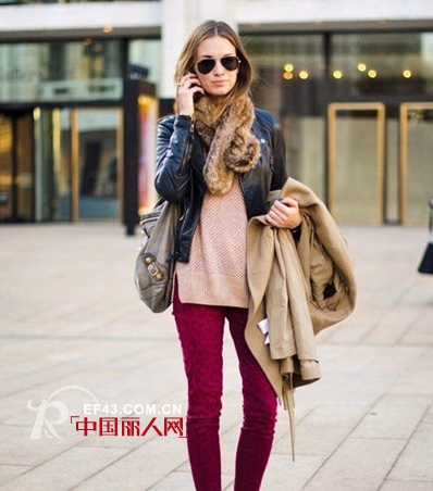1. 皮草围巾+黑色小皮衣+杏色针织衫+枚红色豹纹长裤