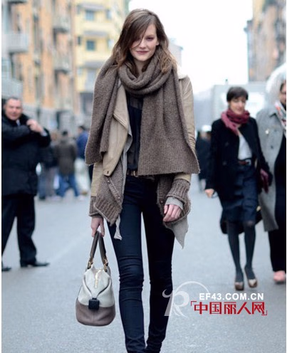 想要搭出小脸的感觉,一定要注意的是不要在脖子上堆积太多,就像这样稍微松一点缠绕在脖子周围,留出一点缝隙,而且还显得轻松随意。皮衣的颜色很素雅,跟牛仔裤的搭配绝佳!