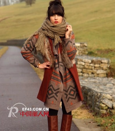 3. 流苏针织围巾+几何图案长款针织开衫+棕色长靴