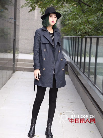 藏青色的风衣代表了内敛的气质,点缀玳瑁纹的纽扣增加了风衣的品质感,领口和肩上的设计突出英挺迷人的气质,搭配黑色打底裤和黑色皮靴还有黑色礼帽,帅酷和内敛兼具,十分有型。