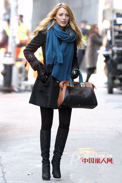 一条大地色的围巾,简单打上一个结,左短右长,高低错落有致,亮棕色的发型提升围巾的时尚韵味。黑色长款大衣风度优雅,黑色皮质短裤与黑色袜裤的混搭,迫不及待地展现女人的妩媚和性感。