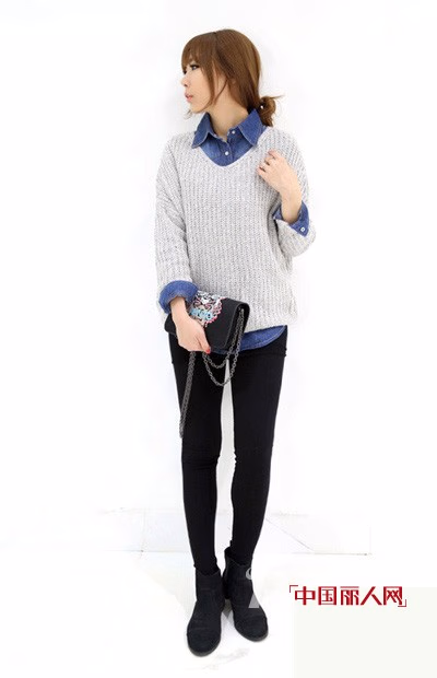浅灰色v领毛衣搭配牛仔衬衫和黑色小脚裤,黑色粗跟短靴,复古风格,清新淡雅中透着简约大方的气息。露出衬衫领子和袖口,十分别致的穿法。