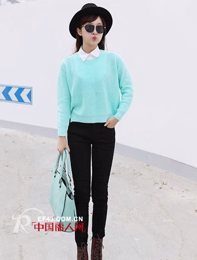 薄荷绿色宽松毛衣搭配白衬衫,不管是颜色还是款式,穿在身上都格外清新淡雅,透着知性的味道,搭配黑色小脚裤和系带短靴,薄荷绿色手拎包也是一大亮点。