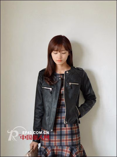 黑色的短款皮衣在秋季很百搭,时尚帅气的黑色皮衣是很多MM们秋季必备的小外套款式,机车服款式很百搭,格子长袖连衣裙内搭,展现学院派的小清新,俏皮的裙摆让MM们很显个性!