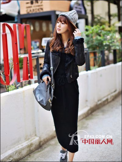 黑色的短款皮衣在秋季很百搭,时尚帅气的黑色皮衣是很多MM们秋季必备的小外套款式,机车服款式很百搭,袖口和衣领的毛毛设计很保暖,黑色的长袖连衣裙搭配上运动鞋,很舒适大方的韩范儿美搭。