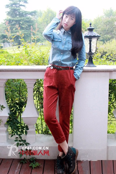 帅气时髦的牛仔衬衫,修身款式,胸前口袋装饰,很经典的设计呢。今年牛仔衬衫依然大热哦。喜欢酷酷风格的女孩子,怎么能不败一件,搭配红色系九分裤,短靴,利落好看。