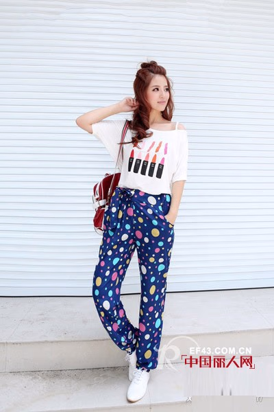 白色短袖短上衣,露肩款式凉爽清新。唇彩图案装饰透着缤纷夏日的气息。搭配彩色大小不一圆点装饰休闲裤,白色球鞋,双肩包,瞬间穿出完美身材与出众气质。