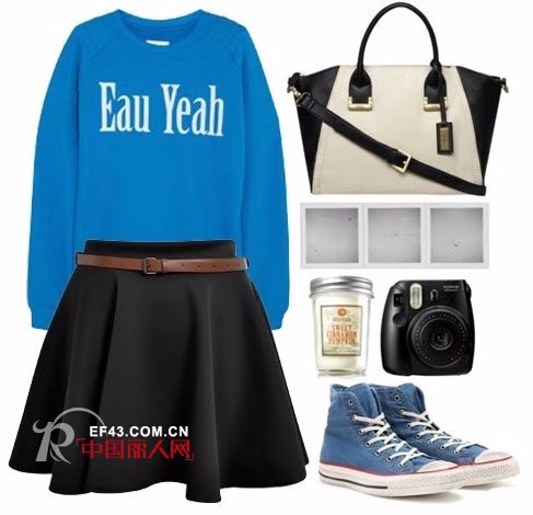 对时尚感兴趣的人肯定知道这一季非常流行蓝色,但是蓝色卫衣的确比较难搭配,那我们就用简单的黑色吧,如果卫衣的蓝色比较浅,可以选择米白色也不错,下面只用一双简单高帮帆布鞋,当然,颜色很重要,而包包搭配白色或者黑白撞色的就可以啦。