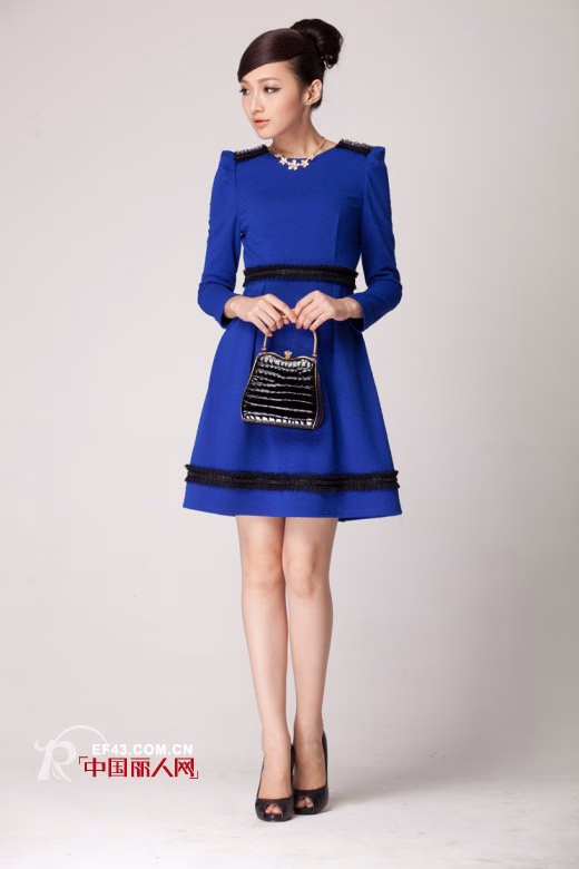 宝蓝色相遇黑色,高贵的色彩,巧妙的结合,精简的版型,收紧腰身,打造柔美的秋日风景,肩上、腰上和下摆的毛须花边,精致美观,散发迷人魅力,无论是单穿还是搭配廓型外套都能很好的展现女人高雅性感成熟的气质。