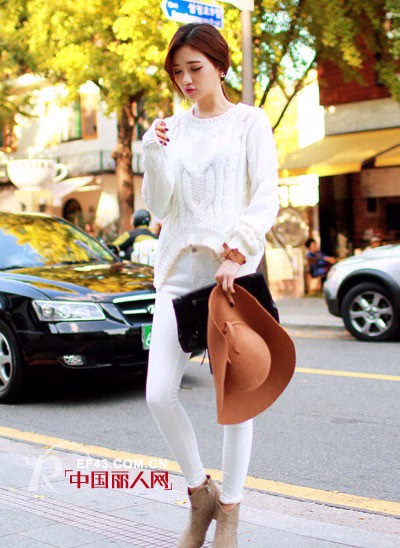 白色麻花针织毛衣怀旧简约,不规则的剪裁隐约展现出性感的腰部腹肌,性感迷人。白色紧身裤搭配短靴,展现出修长的双腿线条。